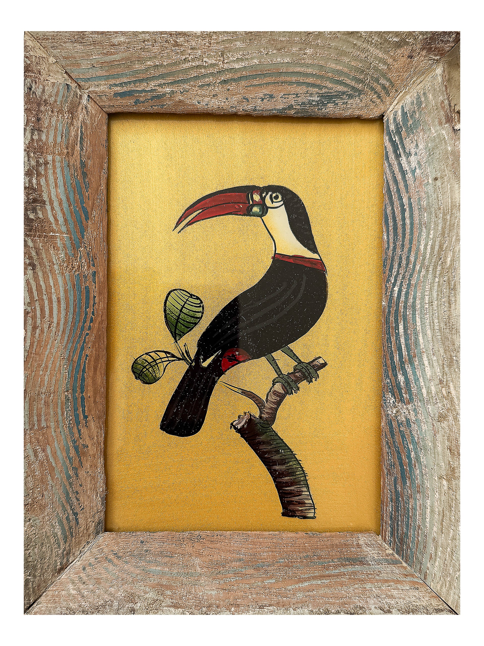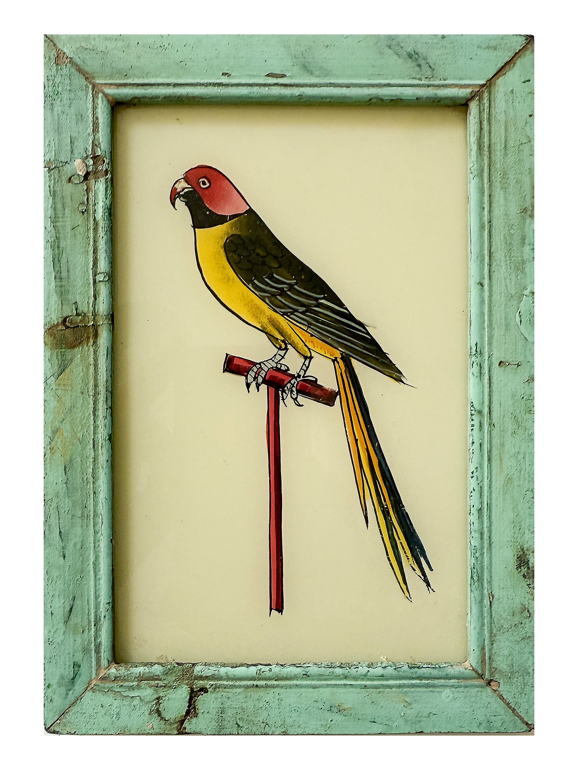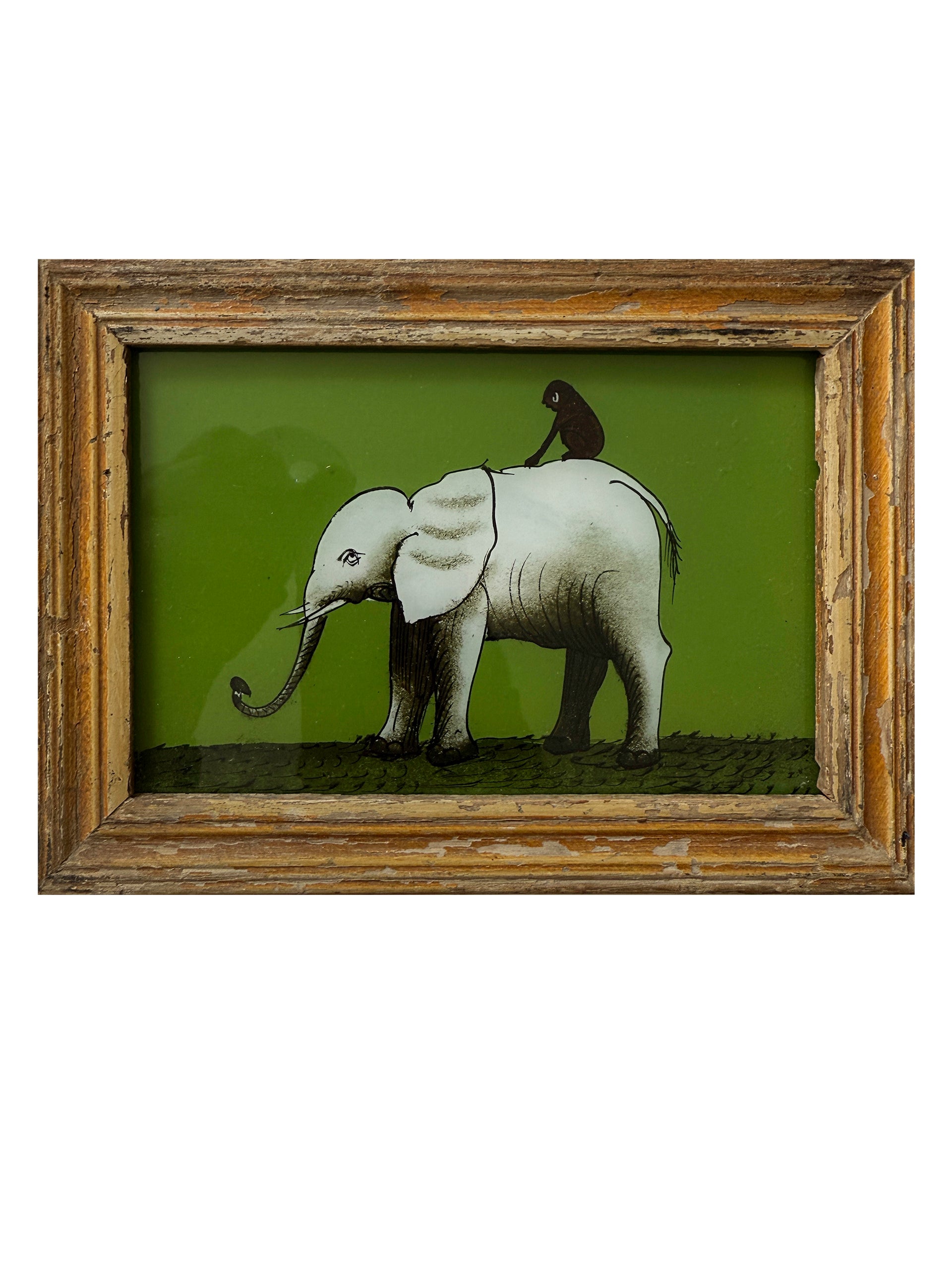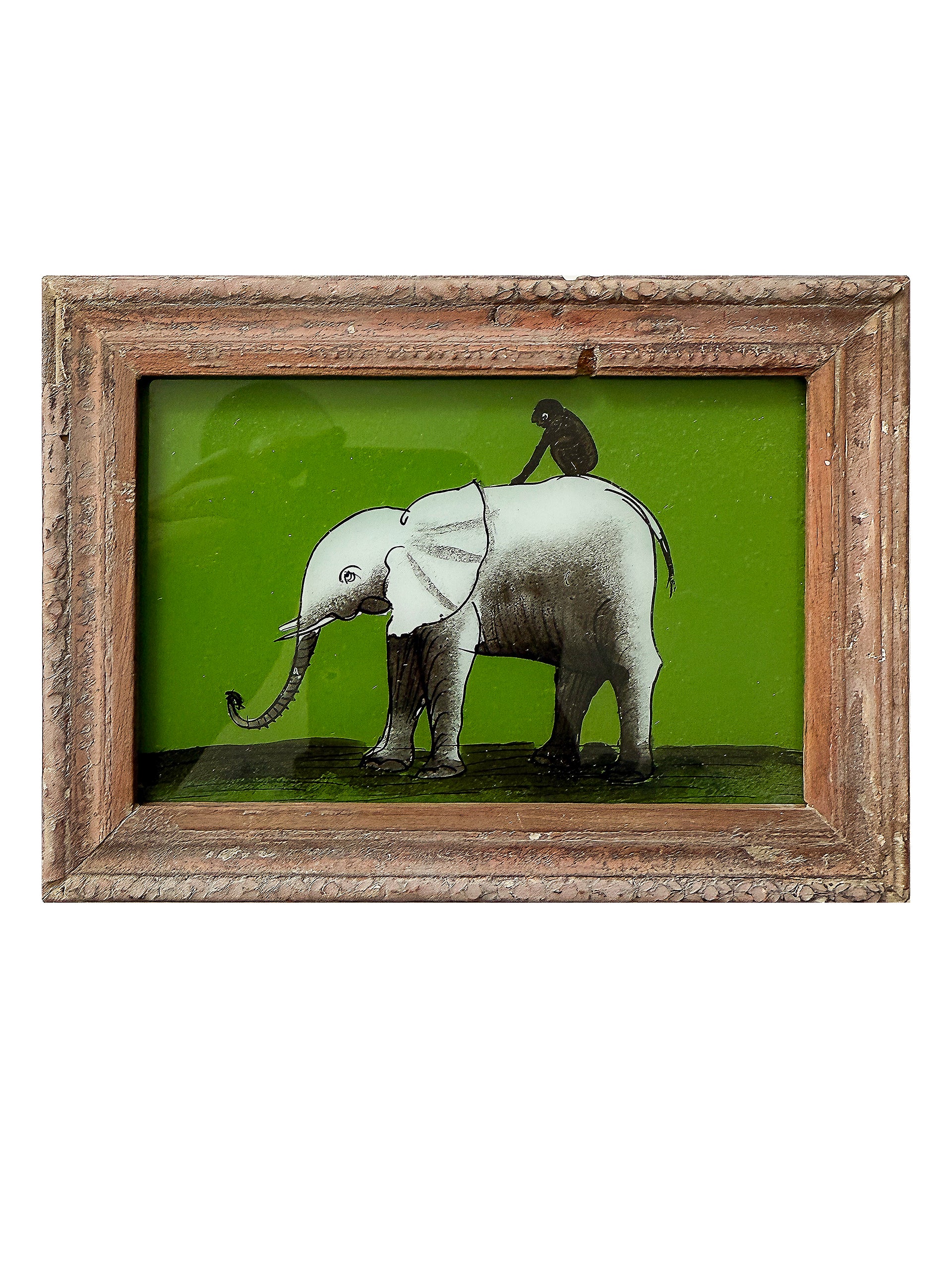 Elephant And Monkey In Yellow Frame - Small Glass Painting