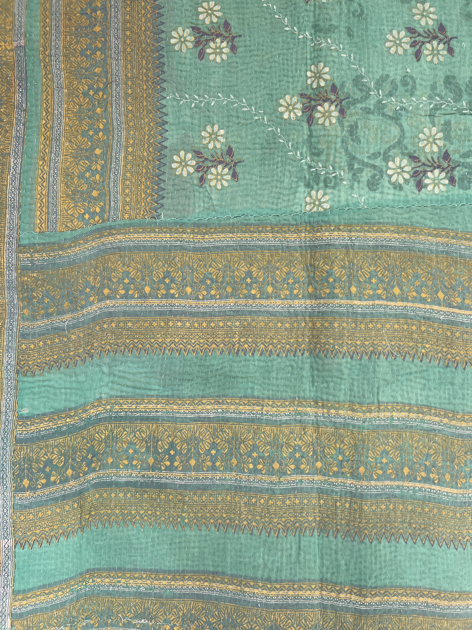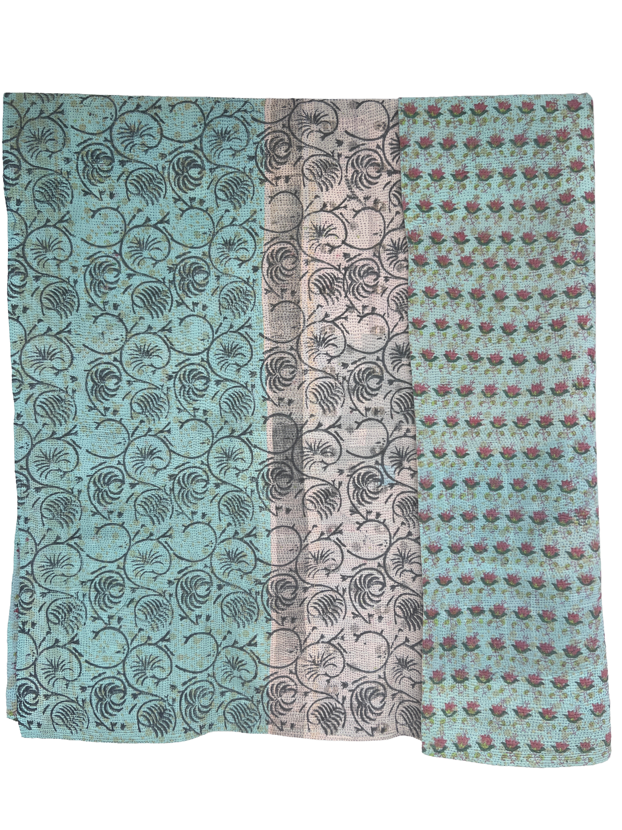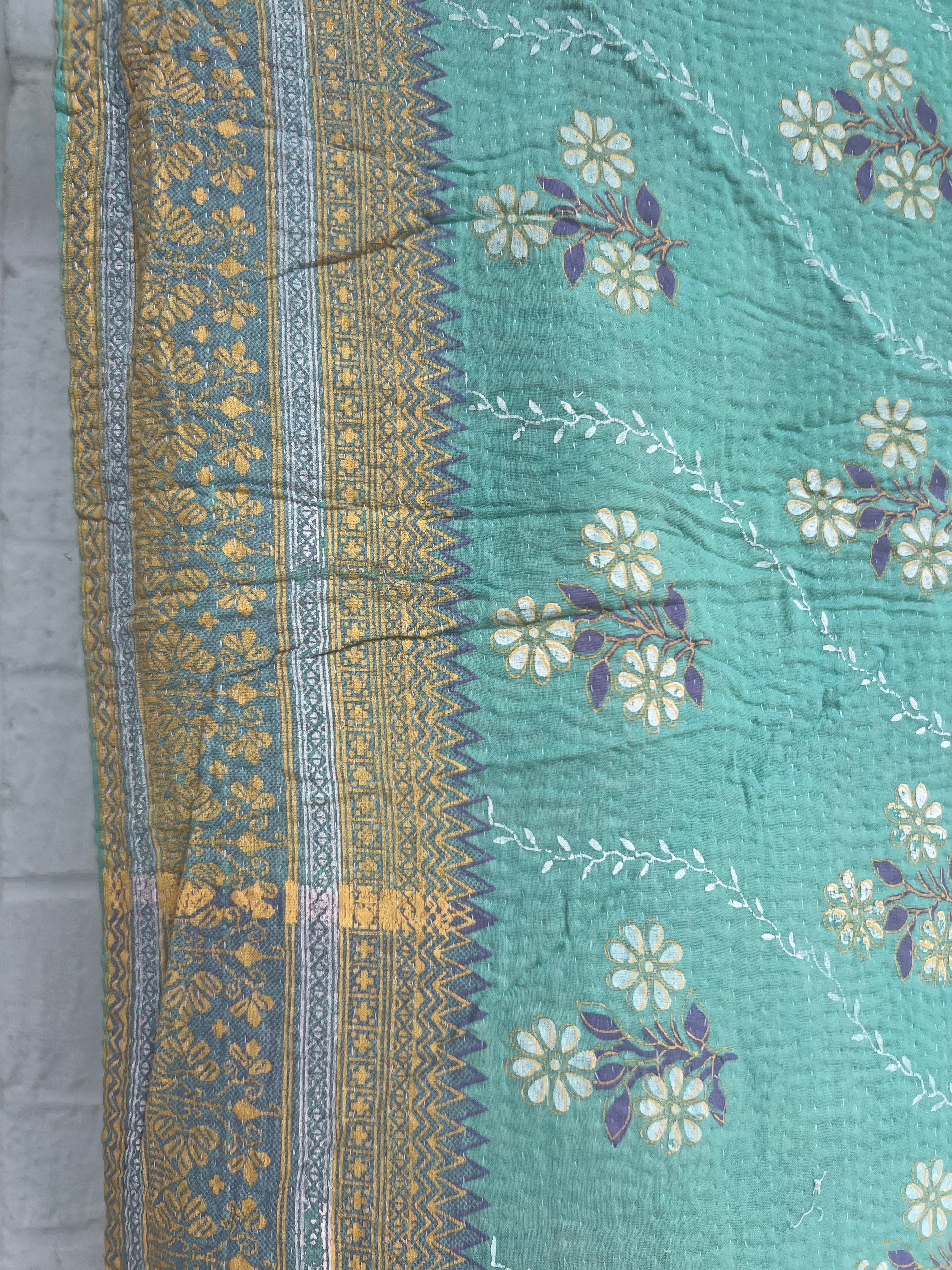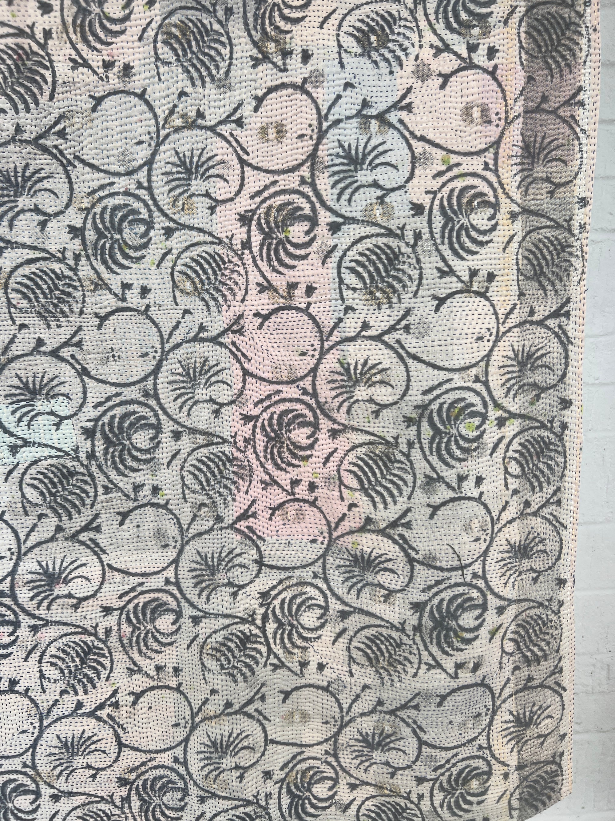 Vintage Kantha Throw with Handblock Print - Floral Print